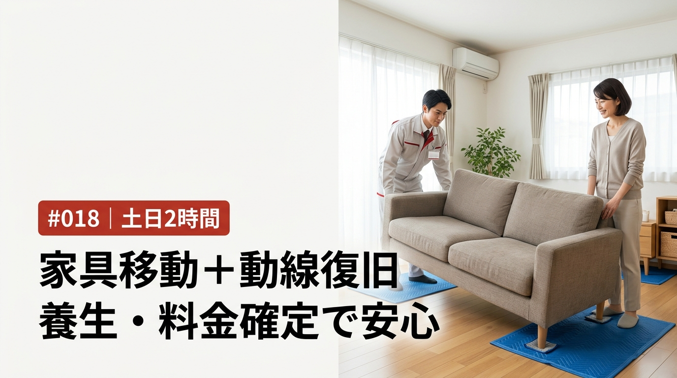 土日・目安2時間で、家具移動+生活動線の復旧。養生(当社運用)、作業前に料金確定、合意なし追加請求な...